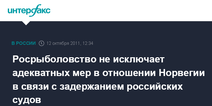 Москва. 12 октября. INTERFAX.RU - В Росрыболовстве допускают принятия адекватных мер в отношении Норвегии в связи с участившимися случаями задержания российских судов в районе архипелага Шпицберген.