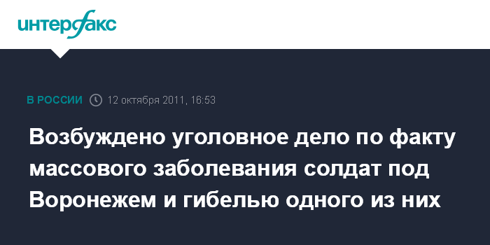 Москва. 12 октября. INTERFAX.RU - Военно-следственные органы возбудили уголовное дело в связи с массовым заболеванием военнослужащих под Воронежем, один из которых скончался.