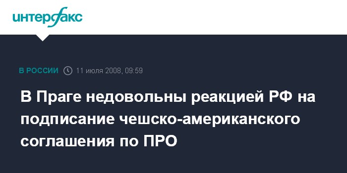 Москва. 11 июля. INTERFAX.RU - Чехия выступила с протестом против недавних высказываний Москвы по поводу подписание договора по ПРО, охарактеризовав их как "угрозы, последовавшие за подписанием в Праге соглашения о развертывании элементов американской противоракетной обороны".