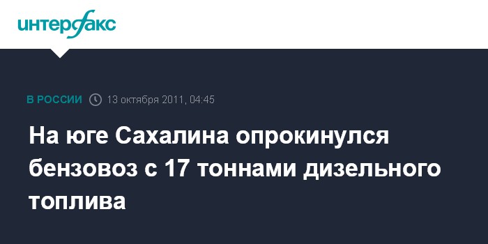 Южно-Сахалинск. 13 октября. ИНТЕРФАКС-ДАЛЬНИЙ ВОСТОК - Бензовоз с дизтопливом опрокинулся не далеко от города Макаров.