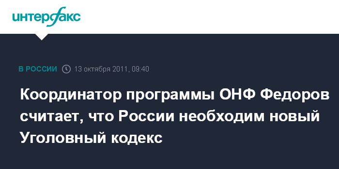 Москва. 13 октября. INTERFAX.RU - Принять в России новый более гуманный Уголовный кодекс предложил руководитель Института социально-экономических и политических исследований, который координирует работу по подготовке Народной программы Общероссийского народного фронта Николай Федоров.