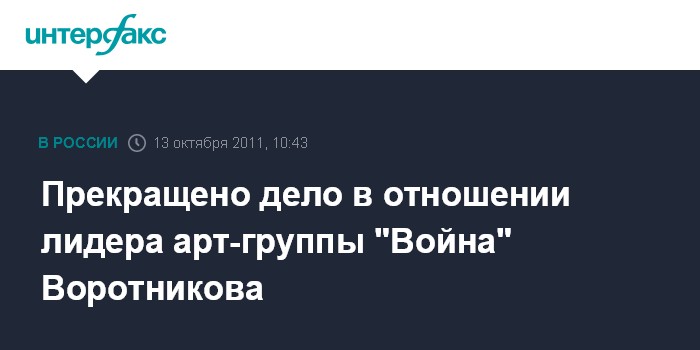 Санкт-Петербург. 13 октября. INTERFAX.RU - Главное следственное управление СКР по Петербургу прекратило уголовное преследование в отношении лидера арт-группы "Война" Олега Воротникова за акцию "Дворцовый переворот", сообщил сайт "Войны" в четверг.