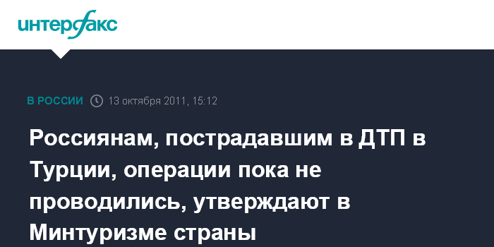 Москва. 13 октября. INTERFAX.RU - Туристам из России, находящимся после ДТП под Анталией в частной турецкой клинике Side Anado Lu Hastanesi, операции не проводились, сообщил порталу "Интерфакс-Туризм" директор представительства в РФ министерства культуры и туризма Турции Джелаль Кылыч.