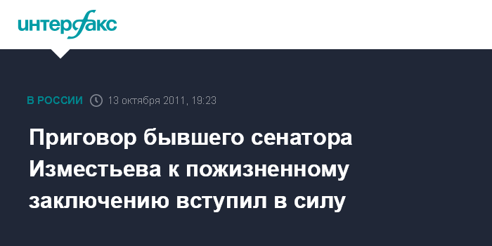 Приговор бывшего сенатора Изместьева к пожизненному заключению вступил в силу