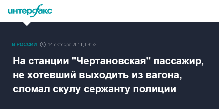 "Накануне утром на станцию метро "Чертановская" прибыл поезд, который высадил пассажиров и должен был направиться в депо. Один из пассажиров не стал выходить из вагона. Выйти его попросил 41-летний сержант полиции, дежуривший на станции", - сказал собеседник агентства.