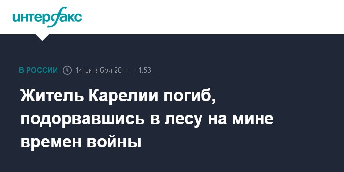 Петрозаводск. 14 октября. INTERFAX.RU - В Калевальском районе в лесу при взрыве мины времен Второй мировой войны погиб 26-летний местный житель, сообщили "Интерфаксу" в МВД республики.