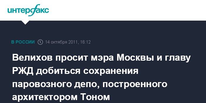 Москва. 14 октября. INTERFAX.RU - Секретарь Общественной палаты РФ Евгений Велихов обратился к мэру Москвы Сергею Собянину и президенту ОАО "РЖД" Владимиру Якунину с просьбой не допустить снос Кругового паровозного депо Николаевской железной дороги.