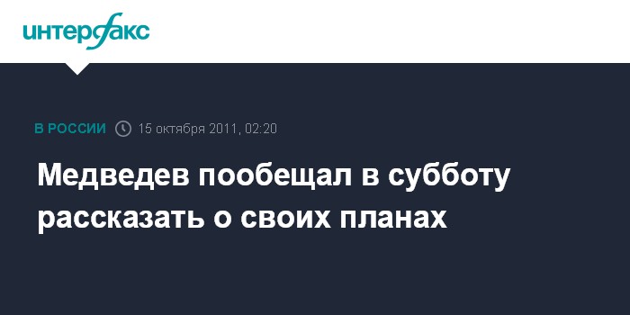 Москва.15 октября. ИНТЕРФАКС - Президент РФ Дмитрий Медведев сообщит о своих ближайших планах в субботу.