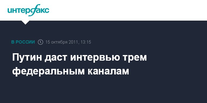 Москва. 15 октября. INTERFAX.RU - Интервью главы правительства РФ Владимира Путина трем федеральным телеканалам - Первому каналу, "России 1" и НТВ, которое выйдет в эфир в понедельник, 17 октября, будет посвящено текущей ситуации в политике и экономике, круг тем для обсуждения не ограничен, сообщил в субботу "Интерфаксу" пресс-секретарь премьера Дмитрий Песков.