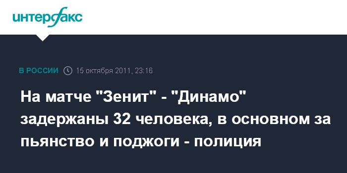 Санкт-Петербург. 15 октября. ИНТЕРФАКС СЕВЕРО-ЗАПАД - Полиция Петербурга до, во время и после матча "Зенит" - "Динамо" задержала более 30 болельщиков, серьезных нарушений общественного порядка в городе не зафиксировано, сообщили "Интерфаксу" в ГУ МВД северной столицы в субботу.