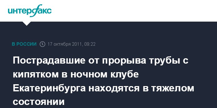 Екатеринбург. 17 октября. INTERFAX.RU - Молодой человек и девушка, получившие ожоги в ночном клубе "Gold" в Екатеринбурге при прорыве трубы с кипятком, находятся в тяжелом состоянии, сообщили агентству "Интерфакс-Урал" в пресс-службе Горздрава.