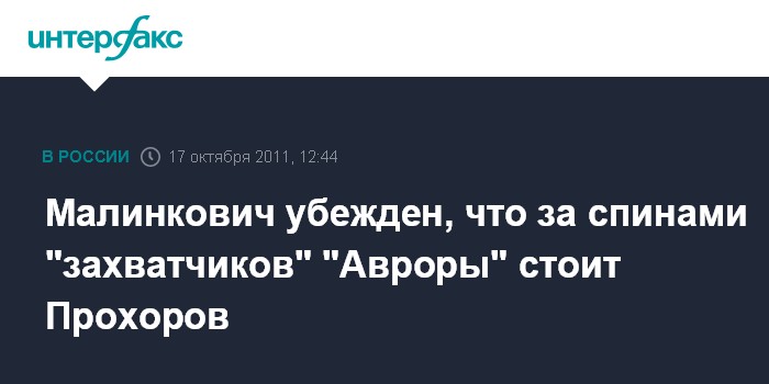 "Я убежден, что это снова след Прохорова. Только тогда (в 2009 году на борту "Авроры" Прохоров устроил банкет - ИФ) это было более масштабно, и Прохоров был в фаворе, а сейчас он изгой и нанял молодчиков-анархистов", - сказал Малинкович "Интерфаксу" в понедельник.
