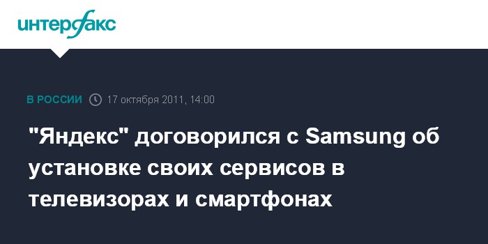 Москва. 17 октября. INTERFAX.RU - Компания Samsung Electronics будет устанавливать в своих интернет-телевизорах (Samsung Smart TV), предназначенных для продажи в России и странах СНГ, сервисы "Яндекса" в качестве "домашних", говорится в сообщении компаний.