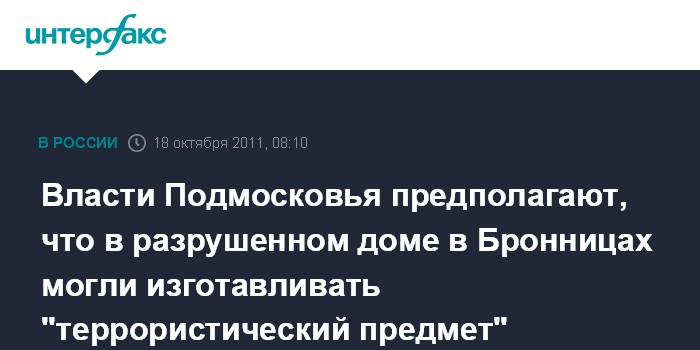 Бронницы. 18 октября. INTERFAX.RU - Комиссия по ликвидации последствий взрыва бытового газа в подмосковных Бронницах не исключает версию о возможном изготовлении в разрушенном жилом доме взрывного устройства, заявил вице-премьер Подмосковья Василий Громов.