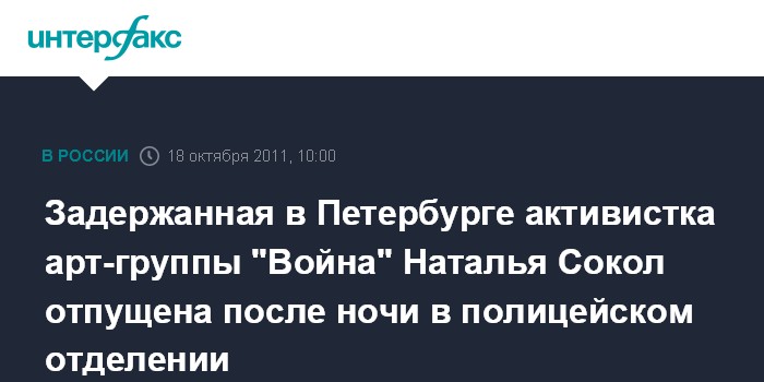 Санкт-Петербург. 18 октября. INTERFAX.RU - Следователи в Петербурге в ночь на вторник задержали активистку арт-группы "Война" Наталью Сокол, всю ночь она провела в полиции с малолетним сыном, а утром ее отпустили, взяв обязательство о явке.