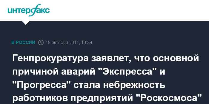 Москва. 18 октября. INTERFAX.RU - Аварии космических аппаратов "Экспресс" и "Прогресс" произошли по причине небрежности работников госпредприятий, подведомственных "Роскосмосу", а также из-за отсутствия со стороны Федерального космического агентства контроля за принятием соответствующих решений, заявляют в Генпрокуратуре.