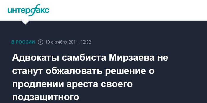 Москва. 18 октября. INTERFAX.RU - Защита чемпиона мира по самбо Расула Мирзаева, после удара которого скончался 19-летний Иван Агафонов, отказалась от намерения обжаловать судебное решение о продлении содержания под стражей ареста своего подзащитного.