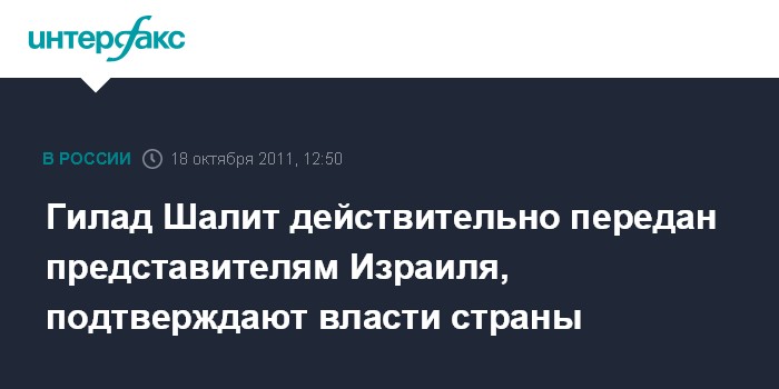Иерусалим. 18 октября. INTERFAX.RU - Власти Израиля подтвердили, что капрал Гилад Шалит передан во вторник израильским представителям, сообщает телеканал Al Jazeera.