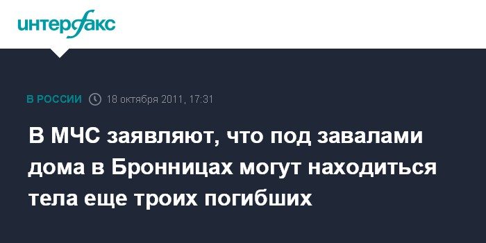 Бронницы. 18 октября. INTERFAX.RU - Спасатели рассчитывают найти под завалами жилого дома в Бронницах, в котором взорвался бытовой газ, тела еще, как минимум, троих погибших, заявил журналистам начальник ГУ МЧС по Московской области Евгений Секирин.