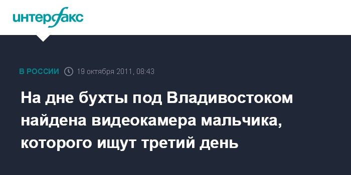"На дне бухты Стеклянная, в районе которой последний раз видели мальчика, найдена видеокамера, предположительно принадлежащая родителям пропавшего. К работе подключились эксперты", - сообщила в среду агентству "Интерфакс - Дальний Восток" пресс-секретарь полиции Управления МВД России Евгения Соковишина.