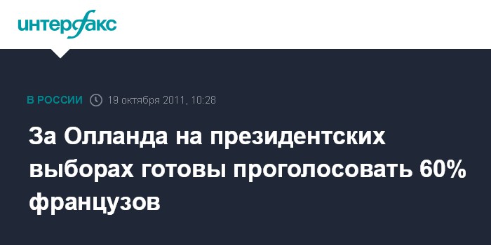Париж. 19 октября. INTERFAX.RU - Более 60% французов выражают готовность проголосовать за кандидата от социалистов Франсуа Олланда во втором туре президентских выборов 2012 года, говорится в опросе института CSA, результаты которого опубликованы в среду.