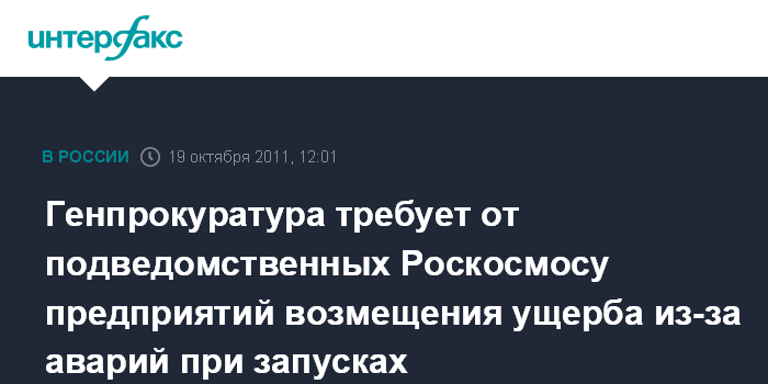 Москва. 19 октября. INTERFAX.RU - По результатам прокурорской проверки причин недавних аварийных запусков космической техники Генеральная прокуратура России поставила вопрос о взыскании с подведомственных Роскосмосу предприятий причиненного ущерб и привлечении виновных лиц к ответственности, сообщил "Интерфаксу" в среду начальник Главного управления по надзору за исполнением федерального законодательства Генпрокуратуры РФ Анатолий Паламарчук.