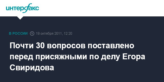 Москва. 19 октября. INTERFAX.RU - Присяжным заседателям в Мосгорсуде предстоит ответить на 29 вопросов по делу об убийстве болельщика "Спартака" Егора Свиридова.