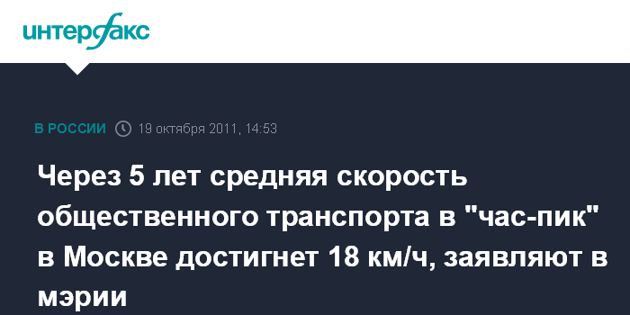 Москва. 19 октября. INTERFAX.RU - Средняя скорость наземного общественного транспорта в "час-пик" через пять лет в Москве должна вырасти до 18 км в час, заявил на пресс-конференции в среду руководитель департамента градостроительной политики Сергей Левкин.