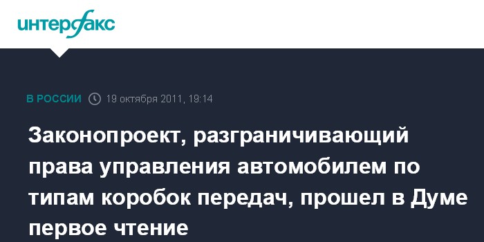 Москва. 19 октября. INTERFAX.RU - Госдума приняла в первом чтении законопроект, который запрещает принимать на работу шоферов, не имеющих российских национальных водительских удостоверений, и разграничивает водительские права для тех, кто ездит на "механике" и "автомате".