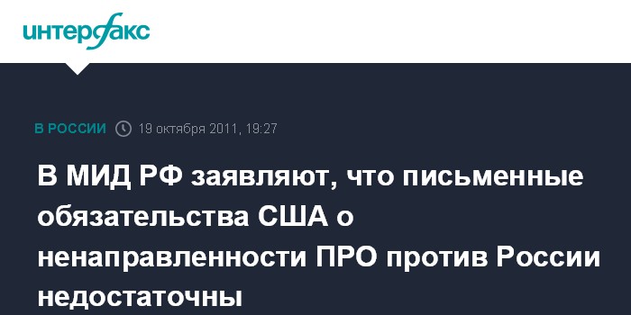 Москва. 19 октября. INTERFAX.RU - В МИД России заявили, что Москве нужны только юридические гарантии ненаправленности ПРО США против России.