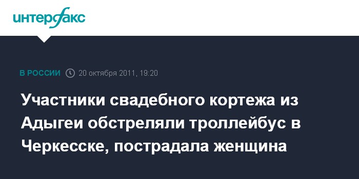 Черкесск. 20 октября. INTERFAX.RU - В столице Карачаево-Черкесии Черкесске участники свадебного кортежа, приехавшего из Адыгеи за невестой, устроили пальбу из травматического оружия по троллейбусу в центре города.