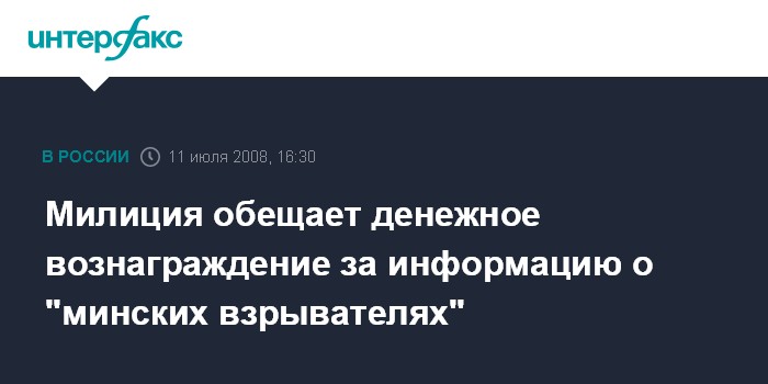 Москва. 11 июля. INTERFAX.RU - Милиция готова выплатить денежное вознаграждение за информацию, которая позволит найти лиц, совершивших взрыв в Минске 4 июля, сообщили агентству "Интерфакс- Запад" в пятницу в министерстве внутренних дел Белоруссии.