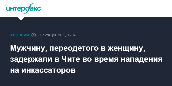 Чита. 21 октября. ИНТЕРФАКС-СИБИРЬ - В Чите задержали бывшего инкассатора, который, переодевшись женщиной, напал на своих коллег, чтобы отобрать дневную выручку фирмы "Сибирская Корона", сообщает в пятницу пресс-служба прокуратуры Забайкальского края.