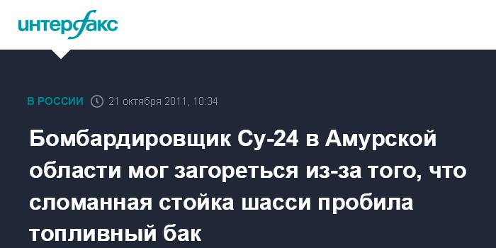 Москва. 21 октября. INTERFAX.RU - Возможной причиной возгорания самолета Су-24 на взлетной полосе в Амурской области является повреждение топливного бака бомбардировщика сломанной стойкой шасси, сообщили в Следственном комитете РФ.