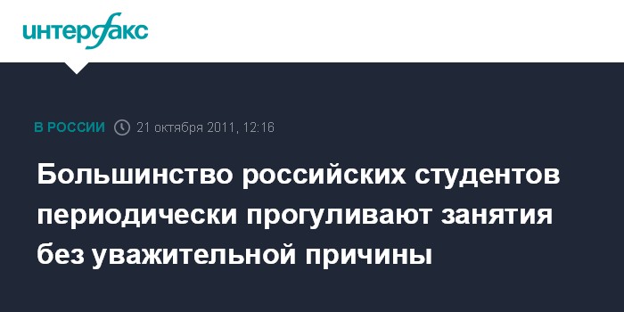 Москва. 21 октября. INTERFAX.RU - 26% российских студентов несколько раз в месяц пропускают занятия без уважительной причины, 53% делают это несколько раз в семестр, и лишь 20% учащихся вовсе не позволяют себе подобного, показал всероссийских опрос портала Career.ru.
