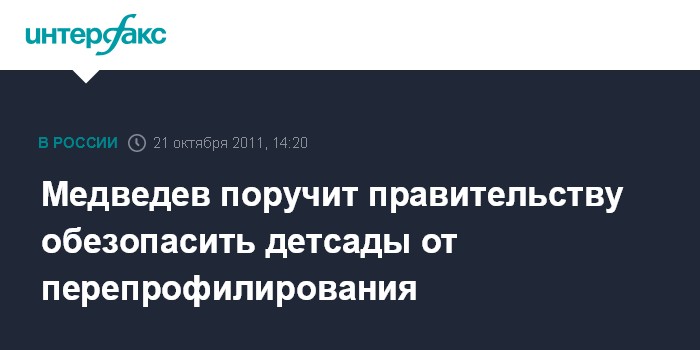 Москва. 21 октября. INTERFAX.RU - Президент РФ Дмитрий Медведев пообещал дать поручение правительству, и в частности Росимуществу, решить вопрос о сохранении статуса детских дошкольных учреждений в случае приватизации госпредприятий, на балансе которых они находятся.