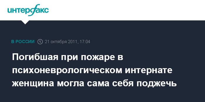 Ижевск. 21 октября. INTERFAX.RU - Пожар в психоневрологическом интернате Воткинска (Удмуртия), в результате которого погибла 77-летняя пациентка, мог стать следствием самоубийства пожилой женщины, считают в следственном управлении СК РФ по Удмуртии.