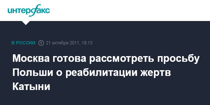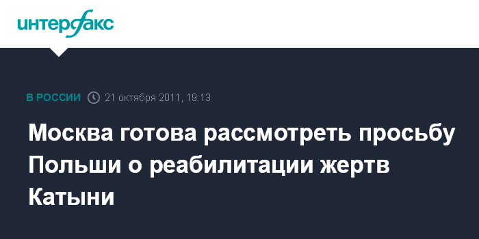Москва. 21 октября. INTERFAX.RU - Россия готова рассматривать просьбу польских властей о реабилитации польских офицеров, погибших в Катыни, заявил министр иностранных дел России Сергей Лавров.