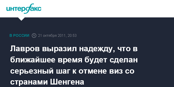 Москва.21 октября. INTERFAX.RU - Министр иностранных дел РФ Сергей Лавров заявил, что в скором времени будет сделан серьезный шаг к отмене шенгенских виз для россиян, а в ближайшие месяцы Россия приступит к соглашению о безвизовом режиме.