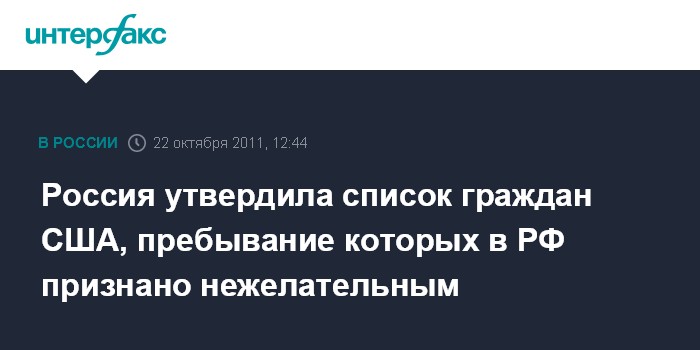 Москва. 22 октября. INTERFAX.RU - В списке граждан США, пребывание которых в РФ признано нежелательным, утвержденном в ответ на решение США закрыть въезд для некоторых российских чиновников в связи с "делом Магнитского", находятся высокопоставленные вашингтонские чиновники, причастные к резонансным преступлениям в гуманитарной сфере, сообщает в субботу МИД РФ.