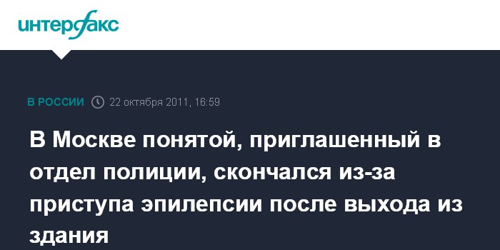 Москва. 22 октября. INTERFAX.RU - Мужчина скончался из-за приступа эпилепсии на территории одного из отделов полиции на юго-западе Москвы, сообщил "Интерфаксу" в субботу источник в правоохранительных органах.
