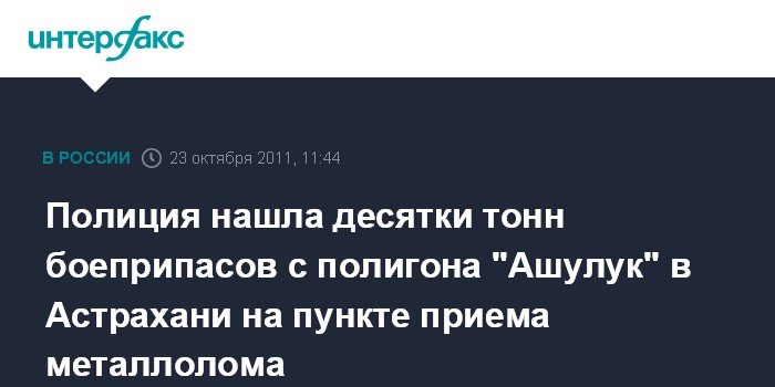 Астрахань. 23 октября. INTERFAX.RU - На пункте приема черного металла сотрудники полиции обнаружили несколько десятков тонн боеприпасов с военного полигона "Ашулук", сообщил официальный представитель УМВД по Астраханской области Петр Русанов.