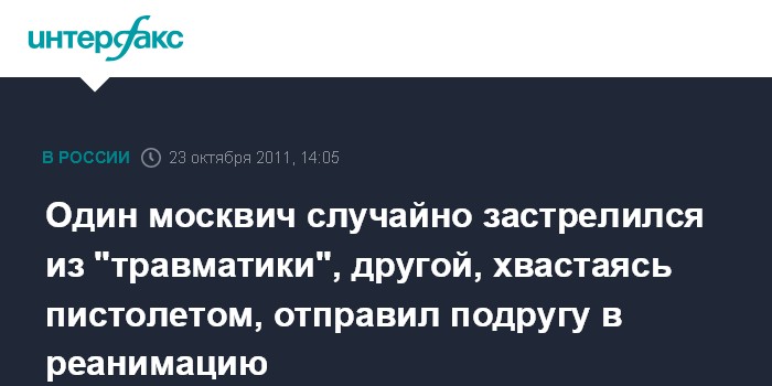 Москва. 23 октября. INTERFAX.RU - Один человек погиб, а другой госпитализирован в реанимацию в результате двух несчастных случаев с травматическим оружием, произошедшим накануне в Москве, сообщил в воскресенье "Интерфаксу" источник в правоохранительных органах.