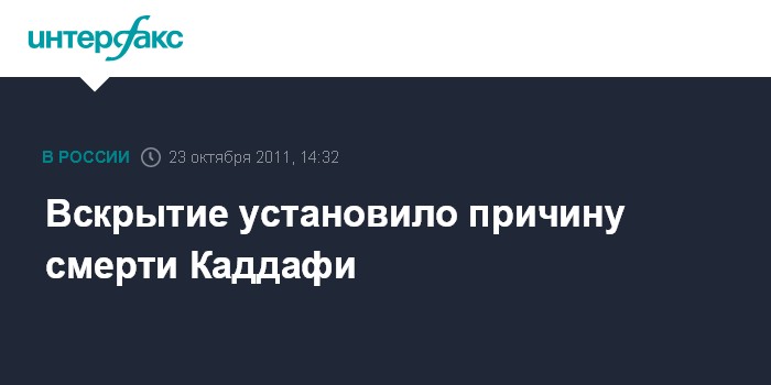 Лондон. 23 октября. INTERFAX.RU - Вскрытие тела полковника Муамара Каддафи, погибшего под ливийским городом Сирт, показало, что он умер в результате огнестрельного ранения, сообщил британский телеканал Sky News.