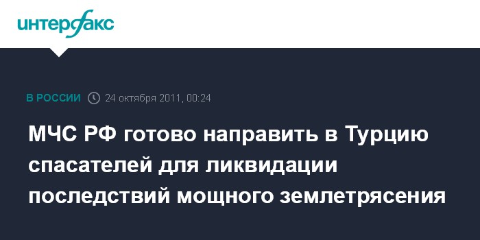 Москва. 24 октября. ИНТЕРФАКС - МЧС России по поручению президента Дмитрия Медведева готово направить в Турцию спасателей и мобильный госпиталь для ликвидации последствий мощного землетрясения.