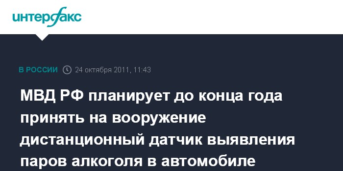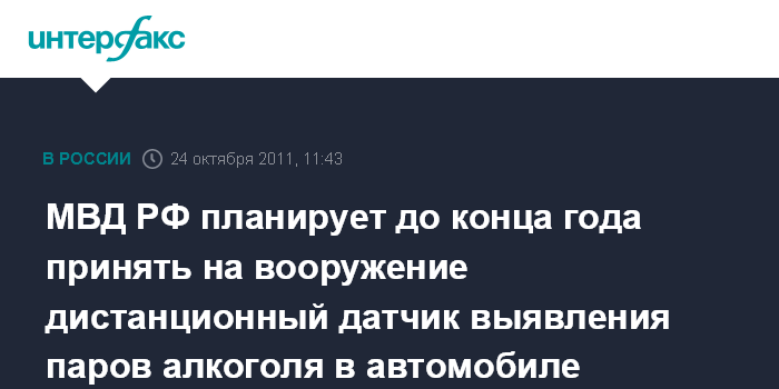 Москва. 24 октября. INTERFAX.RU - Датчик дистанционного выявления паров этилового спирта в салоне автомобиля будет принят на вооружение до конца 2011 года, заявил заместитель министра внутренних дел РФ Сергей Герасимов в понедельник на брифинге в Москве.