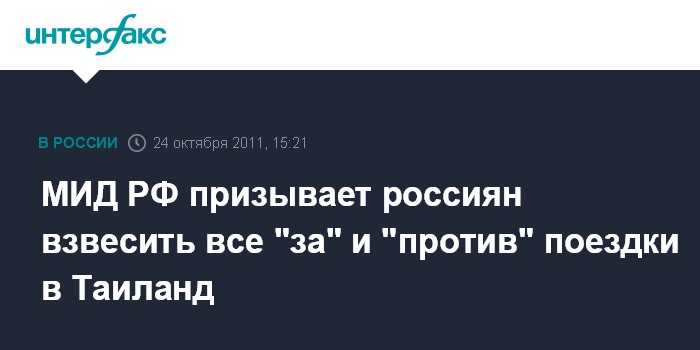 Москва. 24 октября. INTERFAX.RU - МИД РФ выдал рекомендацию россиянам всерьез задуматься о необходимости поездок в Таиланд в связи с наводнением в этой стране.
