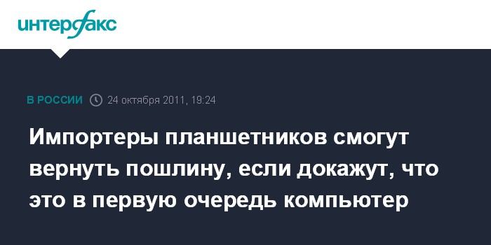 Москва. 24 октября. INTERFAX.RU - Импортерам планшетников вернут излишне уплаченные в бюджет платежи, если они смогут доказать, что основная функция устройства - это компьютер, следует из разъяснений Федеральной таможенной службы (ФТС) РФ.