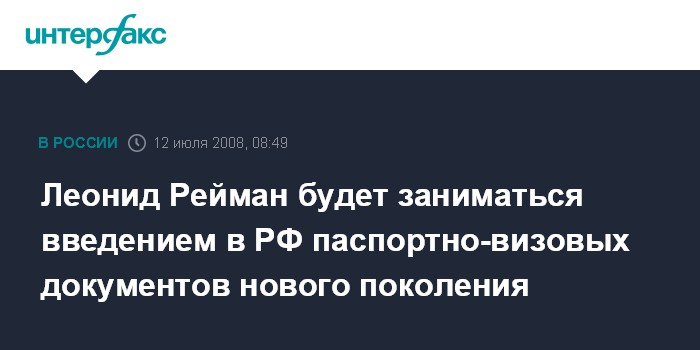 Москва. 12 июля. ИНТЕРФАКС - Президент России Дмитрий Медведев своим распоряжением утвердил советника Президента Российской Федерации Леонида Реймана руководителем межведомственной рабочей группы по подготовке введения в Российской Федерации паспортно-визовых документов нового поколения.