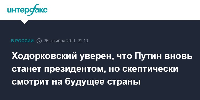 Москва. 26 октября. INTERFAX.RU - Находящийся в заключении экс-глава ЮКОСа Михаил Ходорковский не сомневается, что Владимир Путин будет избран на новый президентский срок.